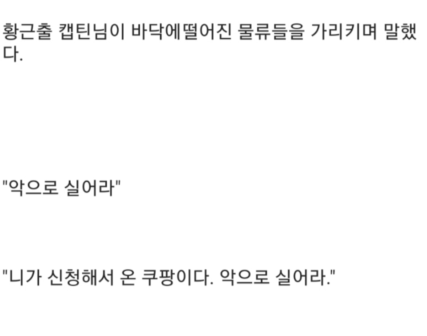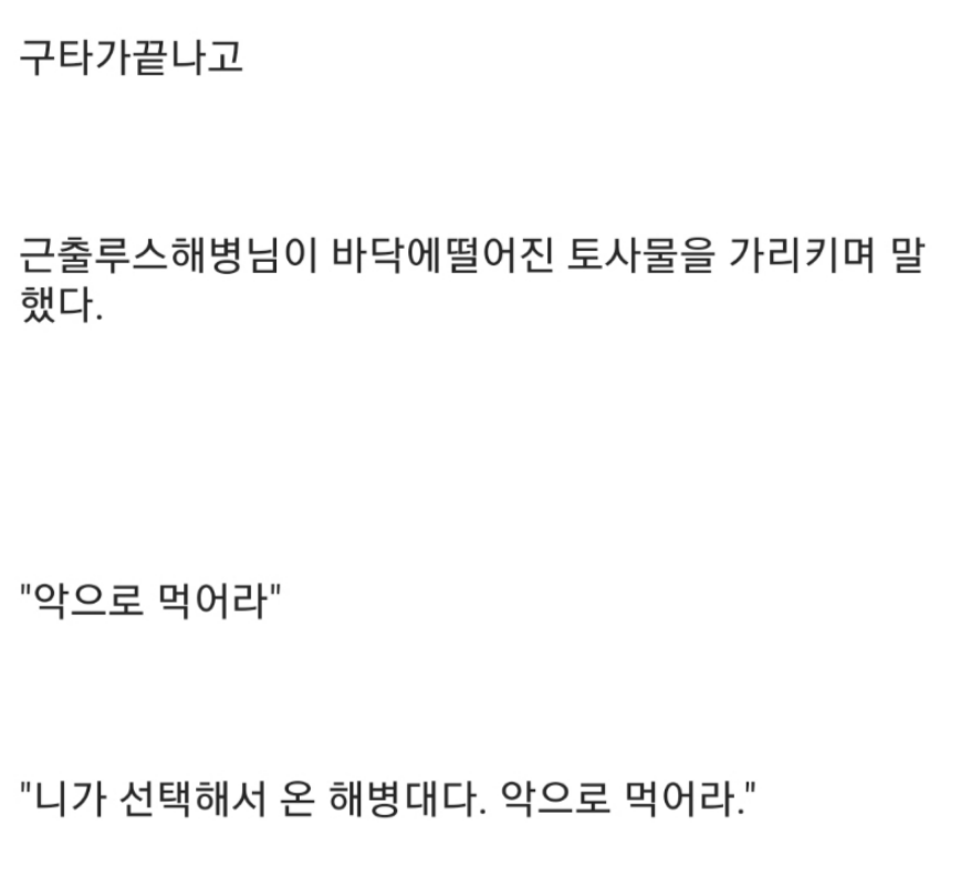 | 황근출해병님이 바닥에 떨어진 맛동산 XXX을 가리키며 말했다. "악으로 먹어라" "니가 선택해서 온 해병대다. 악으로 먹어라." 나는 공포에 질려서 무슨 생각을 할 틈조차 없이 XXX들을 주워먹었고 황근출 해병님의 감독 하에 남은 맛동산까지 전부 먹었다. |