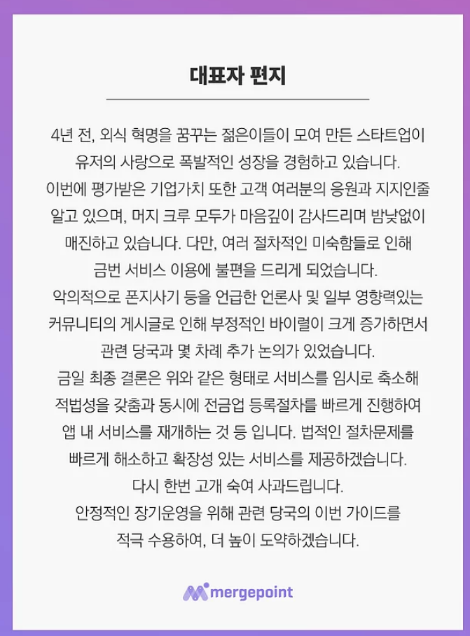 머지포인트 측은 8월 11일 돌연 서비스를 일시 중지하게 됩니다. 접속 불가능 상태가 되면서 그동안 머지포인트를 사용할 수 있었던 프렌차이즈 가맹점들이 사라졌습니다. 예전부터 높은 할인율을 뿌리는데 머지포인트 회사의 수익은 대체 어떻게 나는지에 대한 의문이 있어왔었고, 머지포인트에서 미리 충전해놓은 금액들을 먹튀하는것이 아닌가 하는 우려도 있었습니다.