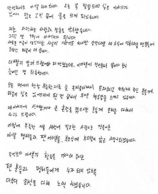 저는 사랑하는 사람과 결혼을 약속했습니다. 그리고 또 9월에 아버지가 됩니다. 새로운 가족이 생긴다는 사실이 기쁘기도 하지만 갑작스러운 제 소식에 당황스러울 팬분들께 죄송한 마음이 더 큽니다.
